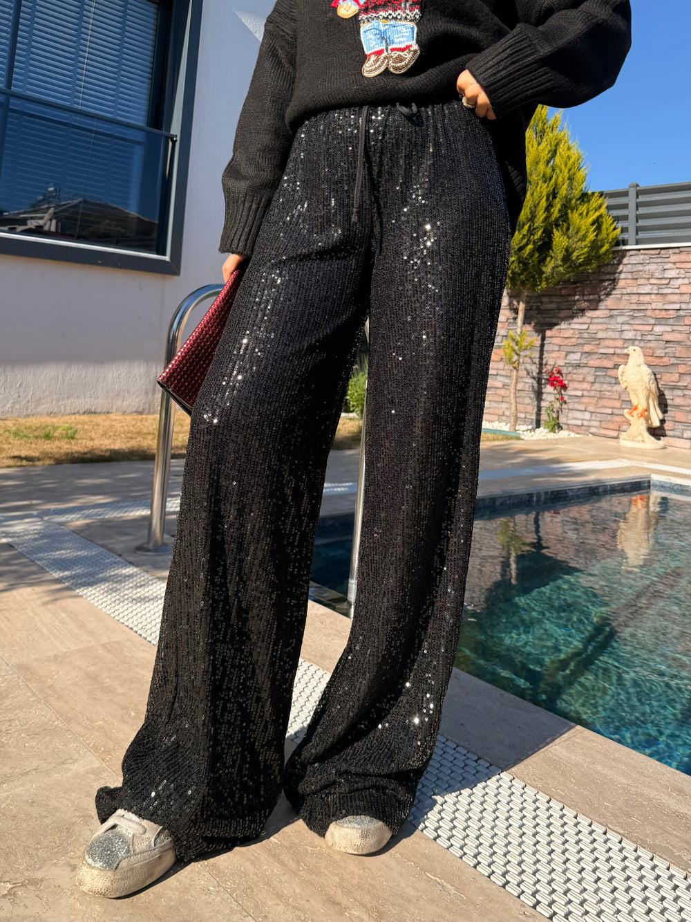 Parlaklığı hoş, aynı zamanda rahat bir pantolon.
